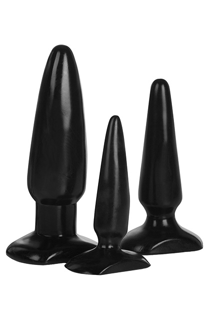Kit de 3 consoladores anales con forma de plug, de diseño rígido y estable, el kit incluye 3 tamaños pequeño (10 cm x 3 cm), mediano (13 cm x 3 cm) y grande (15 cm x 4 cm) ideal para experimentar y avanzar en el sexo anal progresivamente